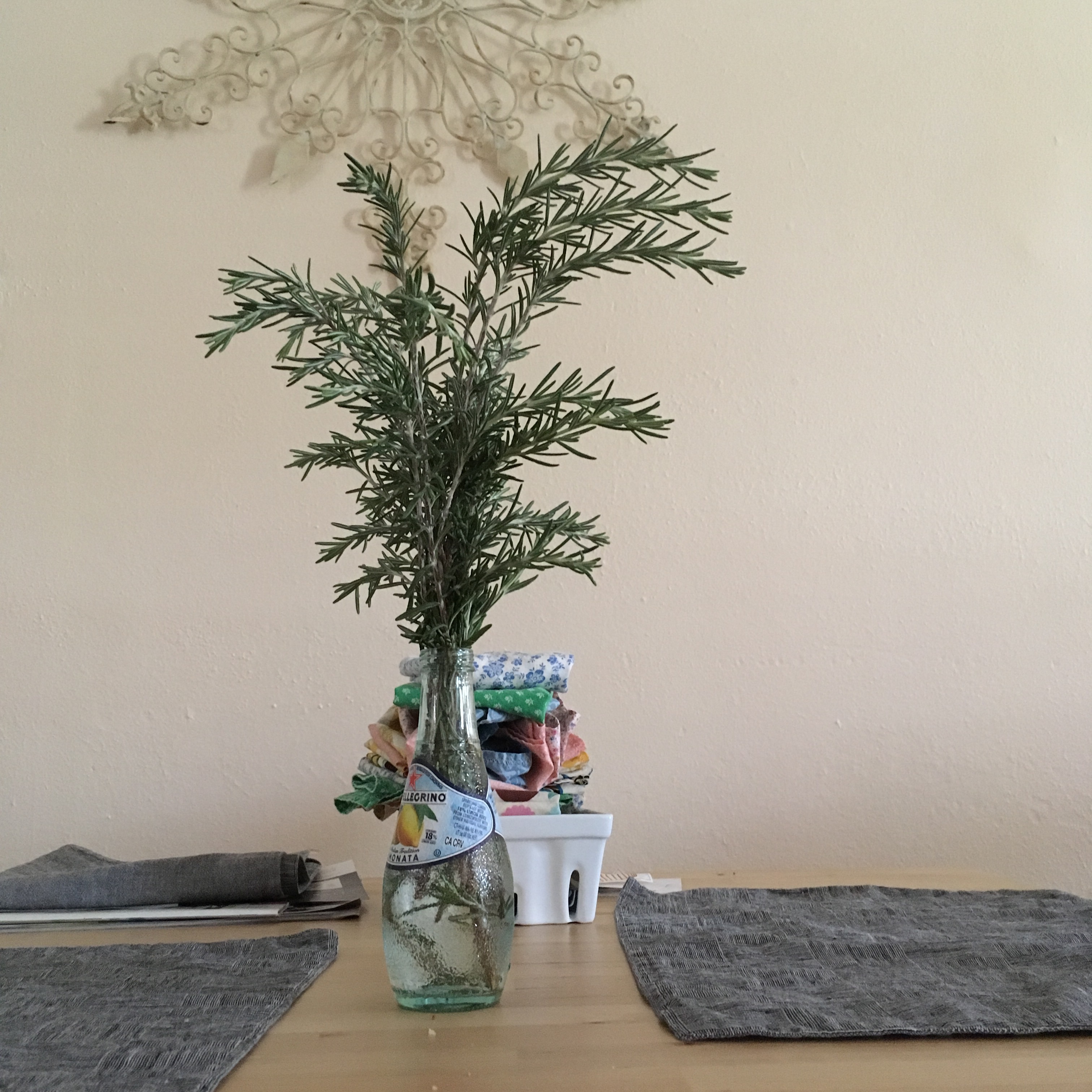 We have a few flowers blooming in the yard, but I don’t feel right picking them when they are still working hard to grow. At the store this morning, I saw they had wildflower bouquets with rosemary in them, and I thought to myself- I definitely can do that.
