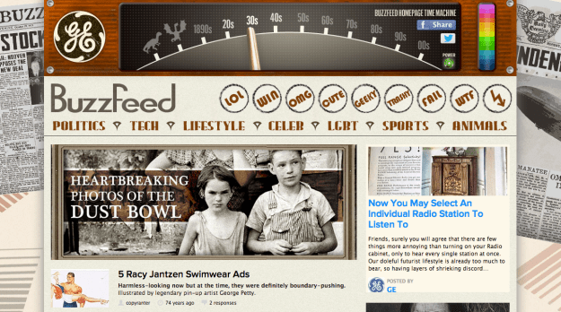 Buzzfeed is currently featuring an awesome advertisement with page takeover by GE right now. I can’t take credit for finding this first as that honor goes to one of the creative directors that I work with. I think the coolest part about this is that not only is it interactive, but it refreshes the page with content and headlines from the time period you select! My favorite right now is the 30’s, partially because the top post is about racy swimwear ads from the 30’s. It also seems to be that people posting photos of their cats and dogs has been a trend ever since the camera was invented.