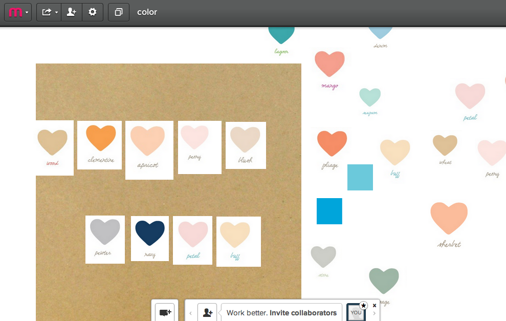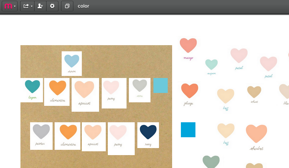 I started by taking screenshots of individual color swatches. I used the cute heart swatches from here. I added them into a mural.ly board, and then started mixing and matching! It made it super easy to move colors around and try different combinations, compare the “feel” of each palette, and it was much easier for the guy to see what I was talking about.