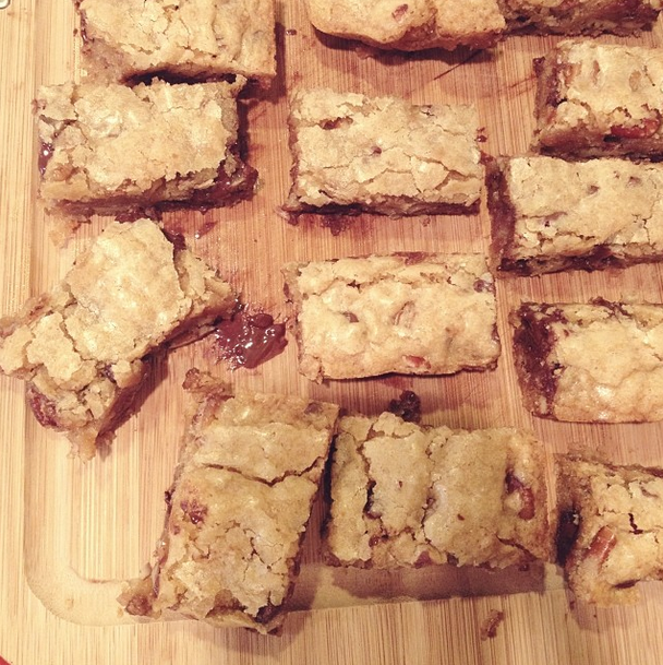 I tried out a new bar cookie recipe over the weekend. Bar cookies are sometimes tricky for me, since I always worry they aren’t baked enough in the middle. I tried a basic blondie recipe, with some big dark chocolate chips, some mini regular chocolate chips, pecans, and coconut. I was too lazy to toast the pecans or coconut, but they were definitely a huge hit with my guinea pigs.