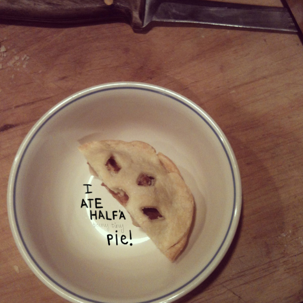 My ma gave me a fun mini pie pan (like this kind) for a gift. Because I like pie and tiny things. We made some tiny apple pies to test it out while I was home.