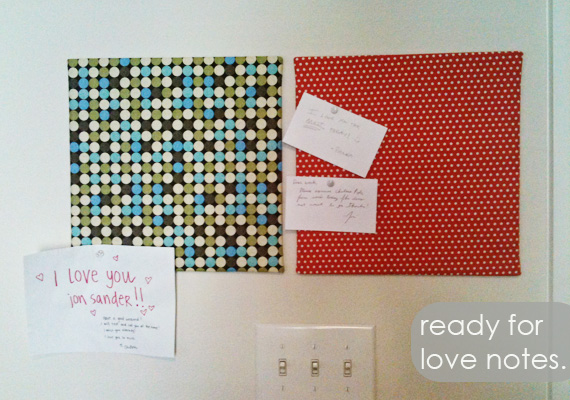 While the bread was cooking, I decided to make some fabric covered bulletin boards. Super easy. Just cut out fabric, warm up the hot glue gun, and put those suckers together. Then we stared at our love notes while we ate warm banana bread.