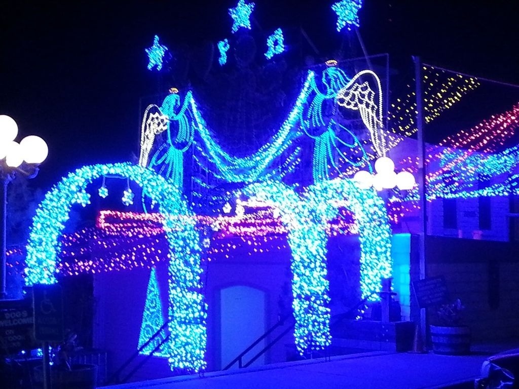 The same lights but during a recent morning coffee run we took to Mozart’s. They look like someone just threw up a string of lights on the side of a building without untangling them.