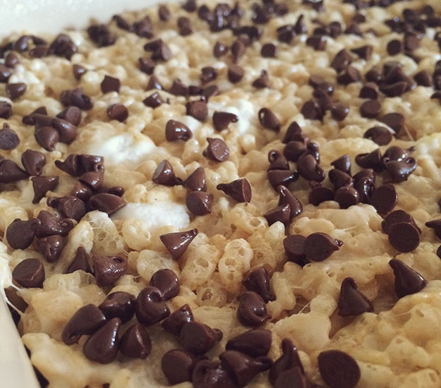Speaking of rice krispie treats, look what I made. One of my besties came over for a sewing lesson last night, and I always like to have some kind of fresh treat available. We currently have these cookies (a couple days old), this cobbler (starting to get a little soggy sad face), so we needed a treat refresher. I made the rice krispie treats fancy by adding some tiny chocolate chips to the top. Almost like a s’more!