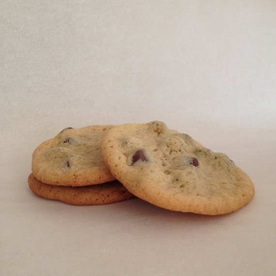 Until then, we will embrace the ice cream weather. My latest batch was coffee ice cream, and I mixed tiny chocolate chips into it. Then I happened to make these very thin chocolate chip cookies. Stick the two together, and you have the perfect ice cream delivery system.
