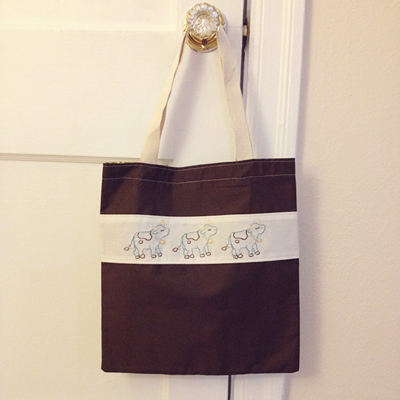 These cows look so pleased with themselves. I guess they should be, since they turned out all cute and stuff. For mother’s day, I made my ma this fancy tote bag, with a little parade of cows embroidered on the front.