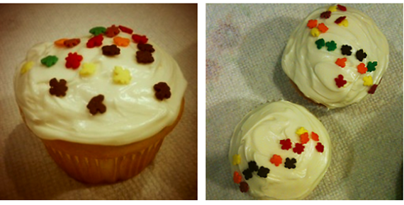 So when you want one bite of cake, you make mini cupcakes! These are so tiny! I made some butter pecan cake, topped with a bit of frosting, and a couple chopped pecans. Everyone at work said they tasted kinda like buttery waffles.