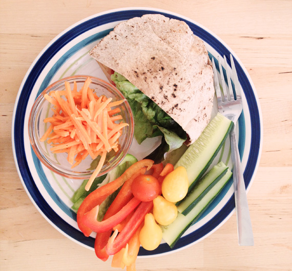 Dinner number one- turkey, salami, and cheese pita sandwich, with cut up veggies. Simple and classic, and super fast.