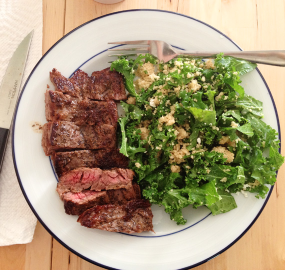 Dinner three- steak and kale salad with couscous. I was a little worried about the raw kale, but after the lemon juice and salt, I kind of roughed it up with a spoon, and it softened up pretty good. I had leftovers for lunch the next day that were also very satisfactory.