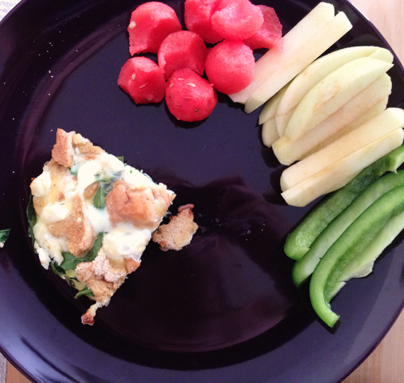 Dinner five- spinach strata with crumbled bread and goat cheese on top. We paired it with some sliced veggies, and even more melon balls! Also, my newest creation, apple sticks (apple slices cut into long skinny pieces). I think they will be all the rage soon. We had the leftover strata for breakfast the next morning, and it was still pretty tasty for being reheated eggs.