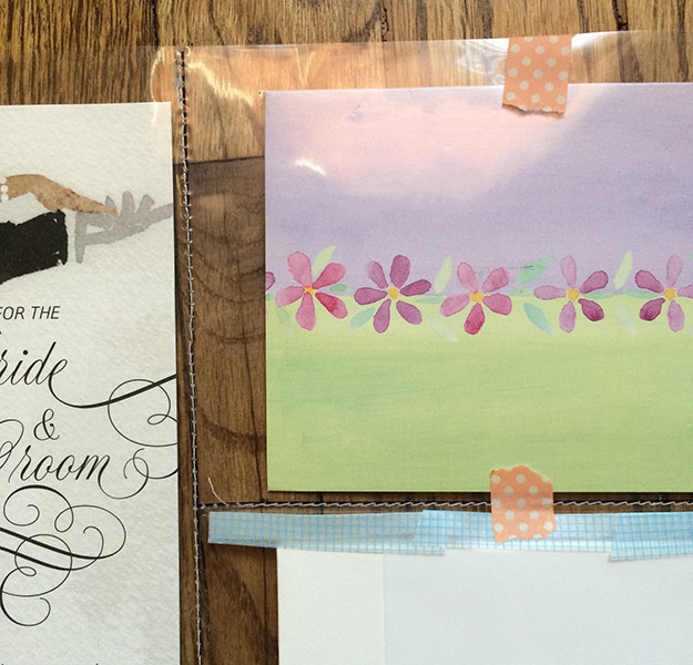We have a pretty neat wedding scrapbook going. I consider it still “going” because I’ve been keeping this box of little keepsakes and cards that I wanted to add to the book. The biggest problem was how to add greeting cards to it. If I shoved them all in one or a couple big pockets, it would be super bulky, and the cards are always falling out. But I recently had a brainstorm, and I’m pretty happy with how it turned out!