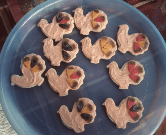 Instead of doing different colors of frosting for the turkey tail, we smashed some candy corns flat, and used them as tail feather decoration. What beautiful little turkeys. Happy Thanksgiving!