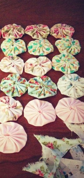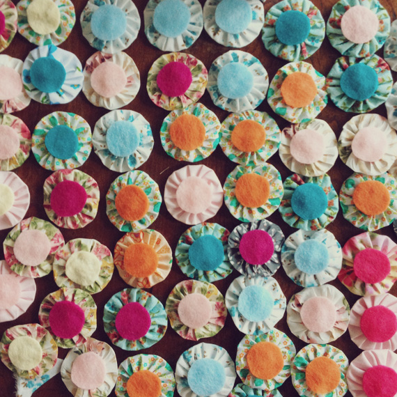 I took some leftover fabric scraps from some other wedding decorations, and I made a million yo-yos. I then scrounged up some felt in coordinating colors, and glued on the extra bits. I attached a pin back to the back of the ribbon.