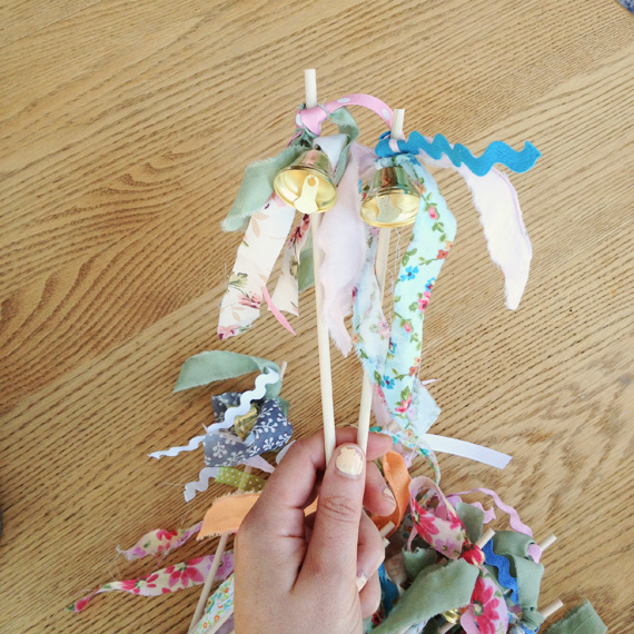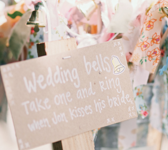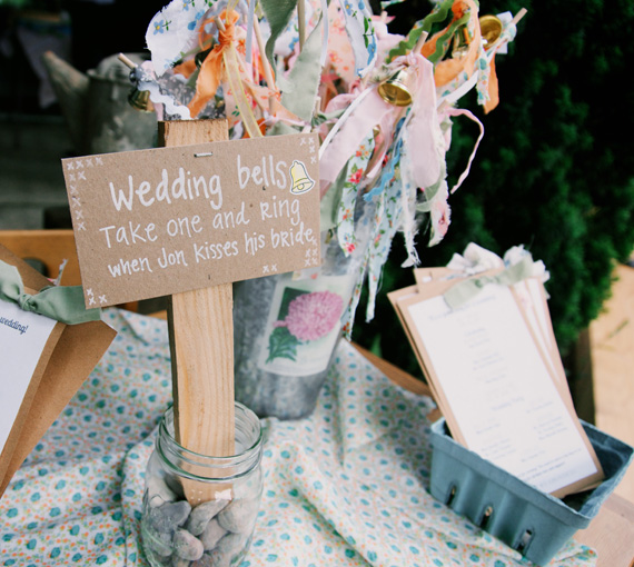 So we also made little miniature versions for all the guests to ring. They are just little scraps of leftover fabric and ribbon, tied onto wooden dowels. It took me some hunting to find some suitable bells that weren’t too big, still made noise, and didn’t cost a fortune. Once they were done, we stuck them all in a little flower pail and added a sign. We saw lots of the little ones running around with them after the ceremony, and at the end of the night, everyone rang them as we drove off together.