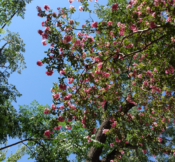We have a crape myrtle tree in our backyard. It fills the sky and the ground with little pink flowers. Even though it is blazing hot out, I still like to be showered with the little petals falling from above.