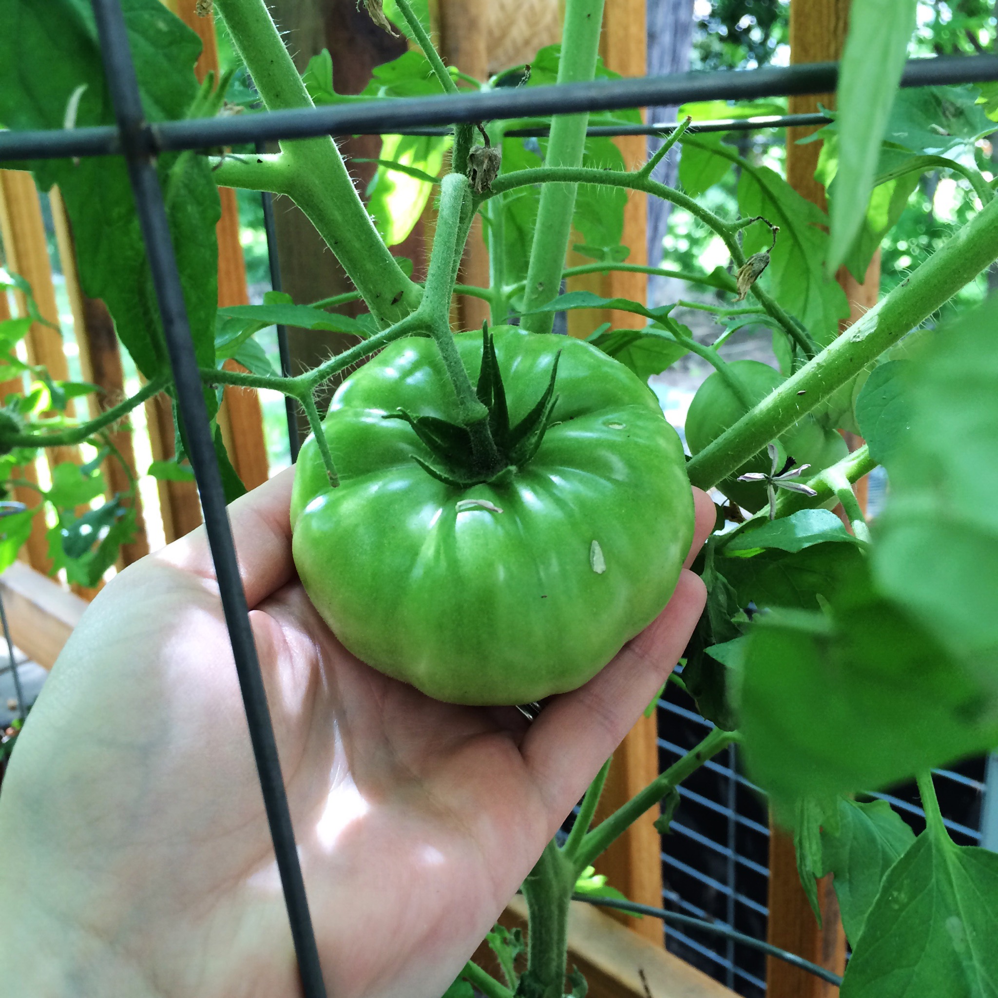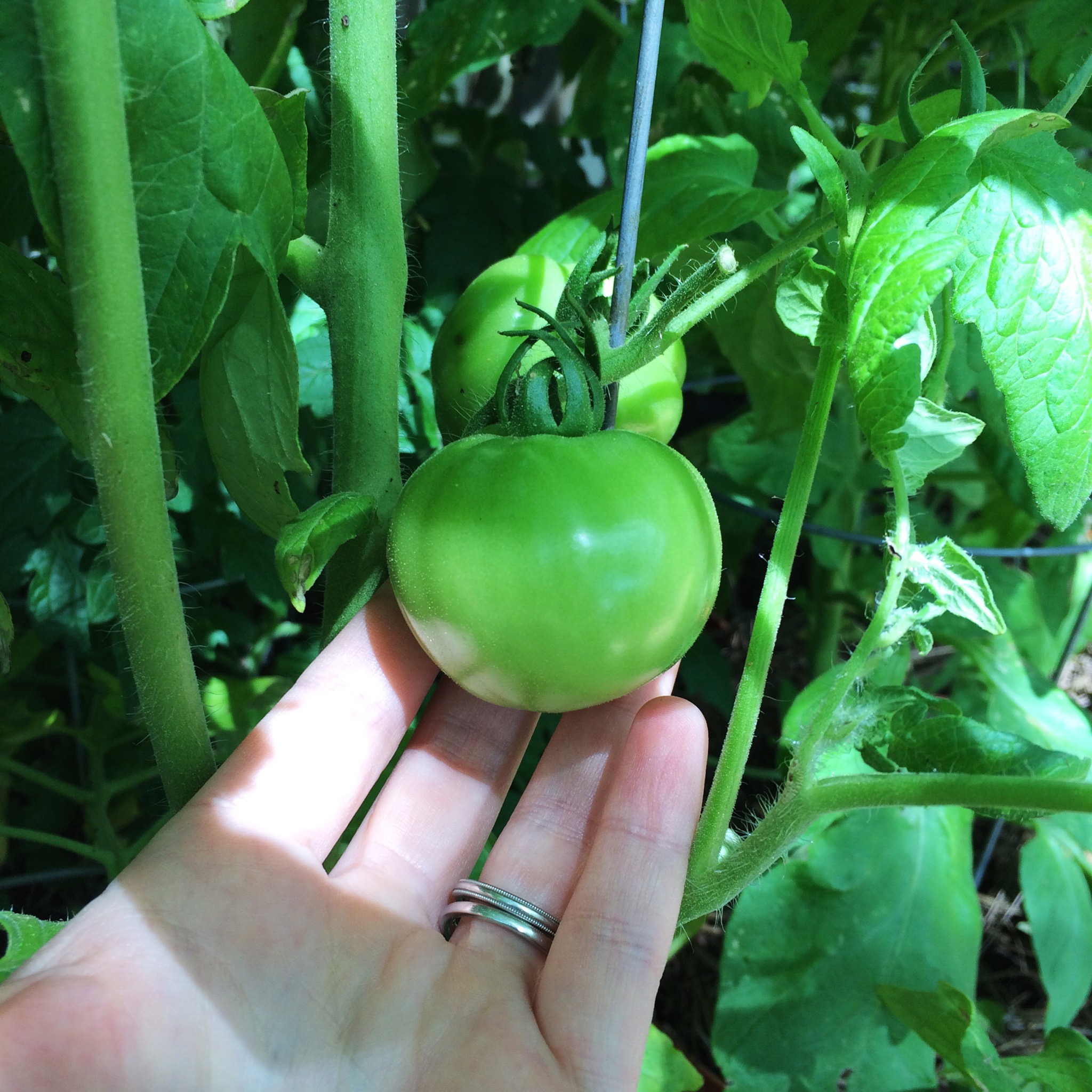 Hoping: Our biggest tomato will be ready soon! We have bacon in the fridge just waiting to be a BLT!