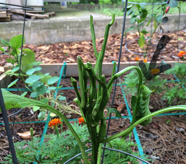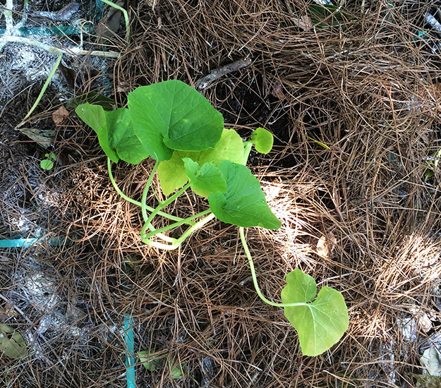 I think our squash plant got a little too moist, and encouraged some bugs to visit. He was doing so well, and then I found a bunch of holes in his stem, and his leaves wilted. I thanked him for his service, and now we have some pumpkins growing there, which I am excited about.