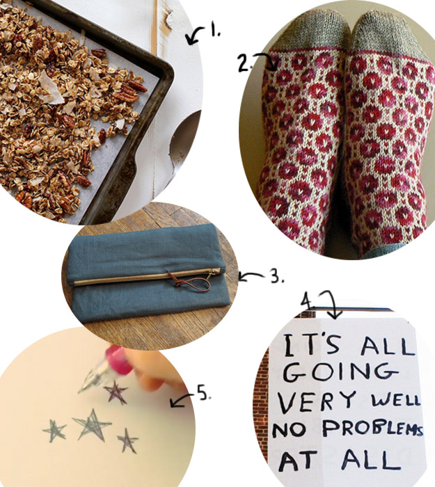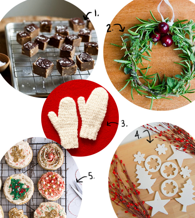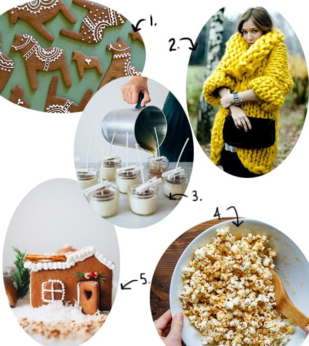 1. Pretty gingerbread horses. 2. How I want to be all the time. 3. Make your own beeswax candles for a useful present. 4. Caramel popcorn reminds me of those big Christmas popcorn tins. 5. And a gingerbread farm, because I love gingerbread.