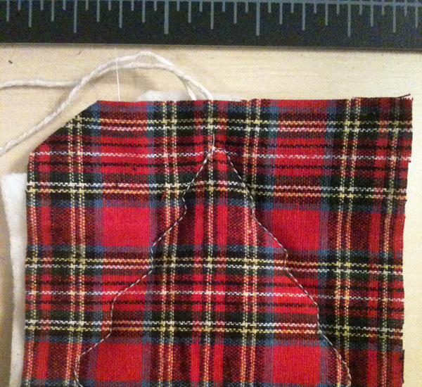 If you want to try to make your own, just draw a shape onto the fabric. I used some cookie cutters as patterns. I sandwiched the fabric with some batting and a little ribbon or twine, and then sewed on the outline. Then I took some pinking shears and cut out the shape. Tie a little bow or knot, and you’re done.