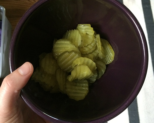 We have sooo many cucumbers. They are one of the only veggies in the garden not complaining about all these flooding rains. Just keep growing is their motto. I picked a big batch of pickling cucumbers last week, so now we have a couple jars of sweet pickles, to eat with our sandwiches or as snacks. We made some of Jon’s favorite pulled pork in the crock pot, and ate it on sandwiches with bbq sauce, and lots of these pickles!