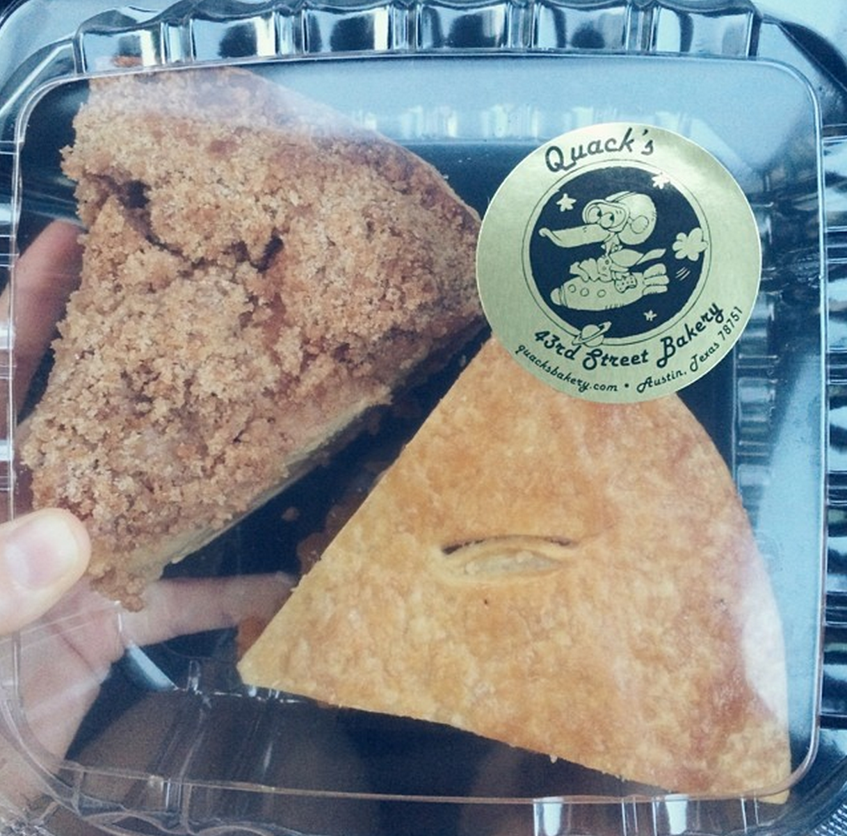 Our first pie adventure was to Quack’s Bakery. It was a not too warm evening, and we sat outside, sharing pie with friends. We shared a slice of peach pie and chocolate cream. And somehow the air vents wafted fresh pie right past our noses, and I wanted to camp in their parking lot forever.
