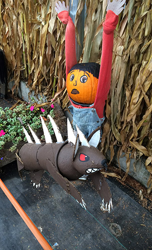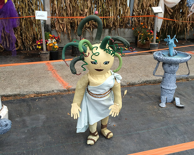 Each year, the patch decorates pumpkins to go with a theme. This would be the coolest job. The theme was mythological creatures, and one of my favorites was Medusa, with her “snake” hair.