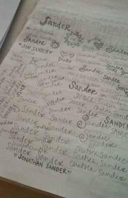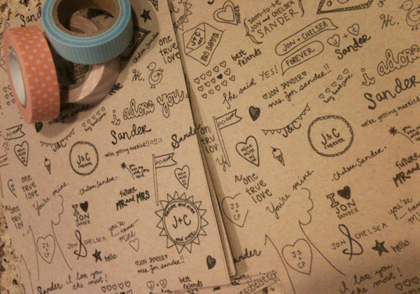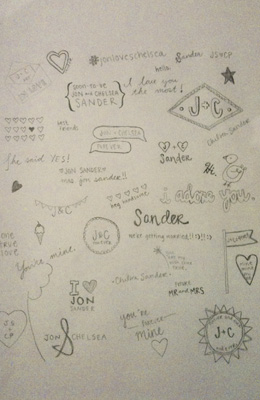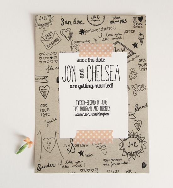Anyway, I doodle a lot at work to keep my hands busy, and one day, my doodles reminded me of the middle school notebook when you doodle a cute boy’s name all over it. I thought that might be a cute idea for a save the date.