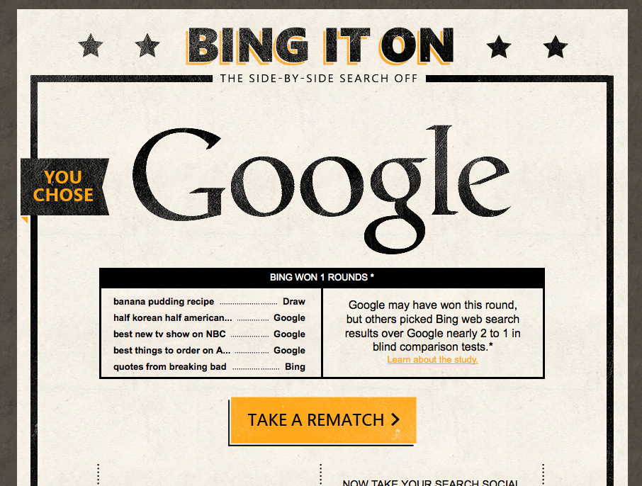 We were watching TV on a Saturday afternoon and saw a commercial by Bing that promoted a Bing vs. Google Challenge with the claim that in a blind test people picked Bing results over Google.